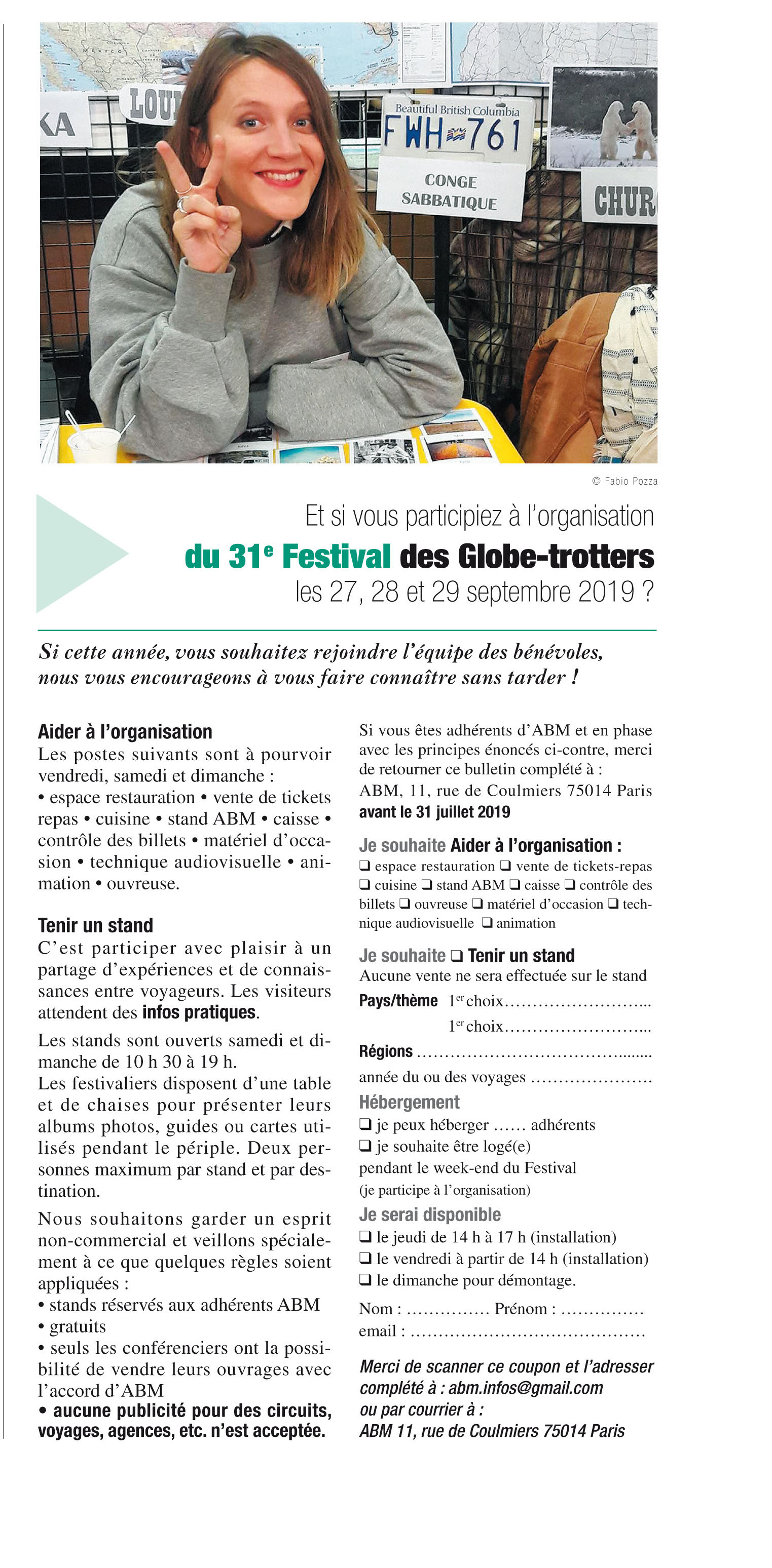 Les visiteurs attendent avant tout des infos pratiques. Les stands sont ouverts samedi et dimanche de 10 h à 20 h. Un comité d'organisation étudie vos candidatures et se réserve le droit de refuser toute demande. Les festivaliers retenus disposent d'une table et de chaises pour présenter leurs albums photos, guides ou cartes utilisés pendant leur périple. Nous souhaitons garder un esprit non-commercial et nous veillons spécialement à ce que quelques